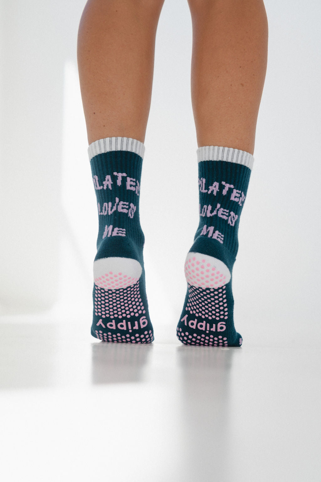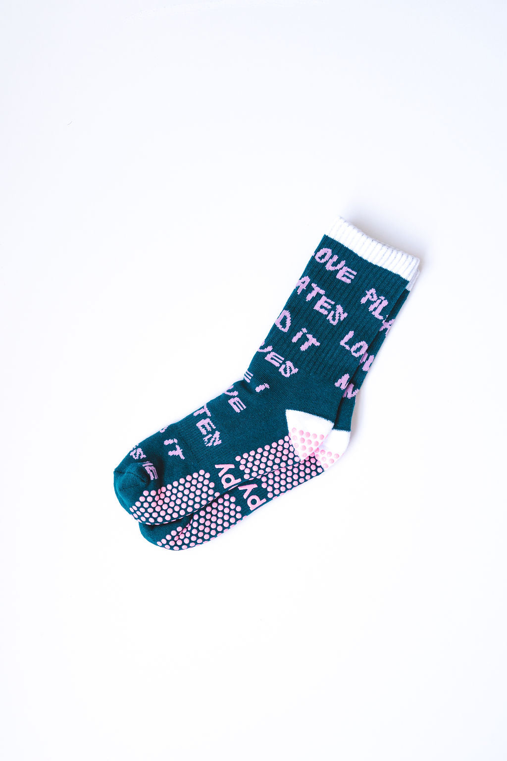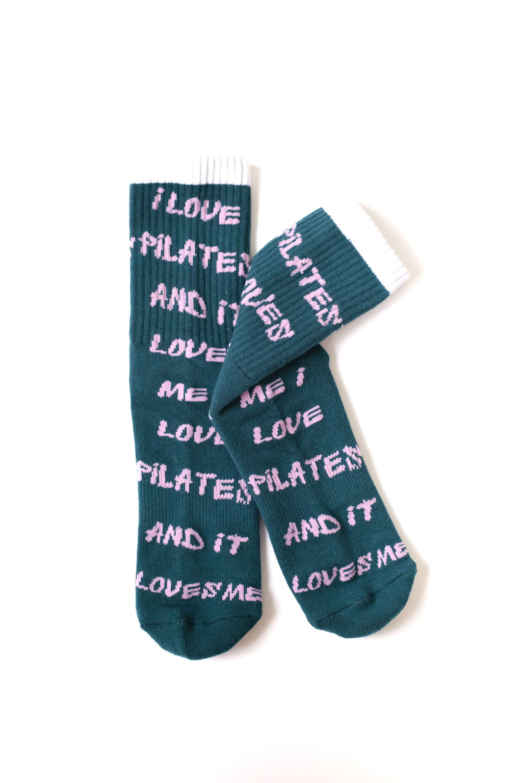 - Teal coloured, graffiti street style 'i love pilates and pilates loves me' text in purple