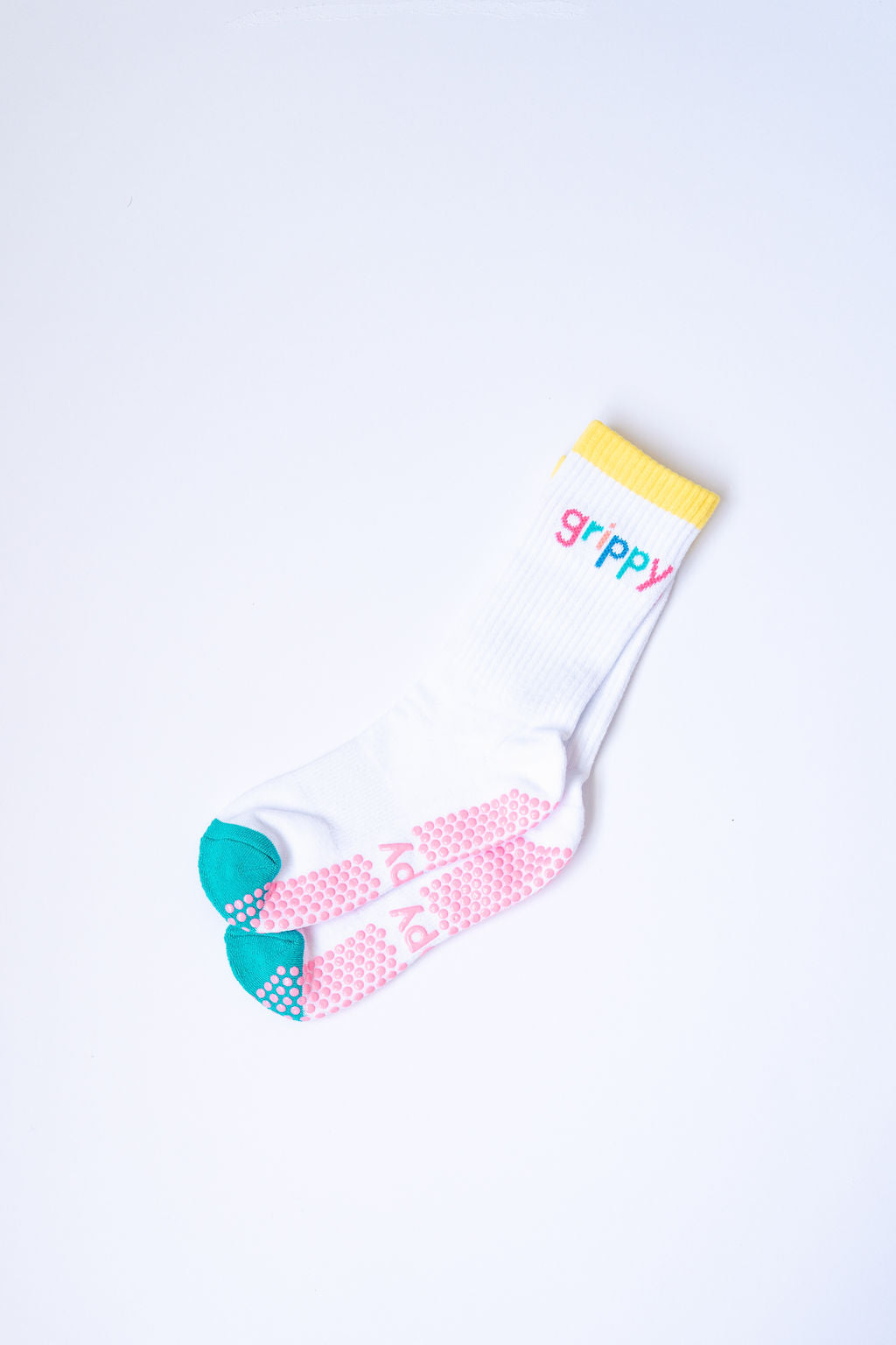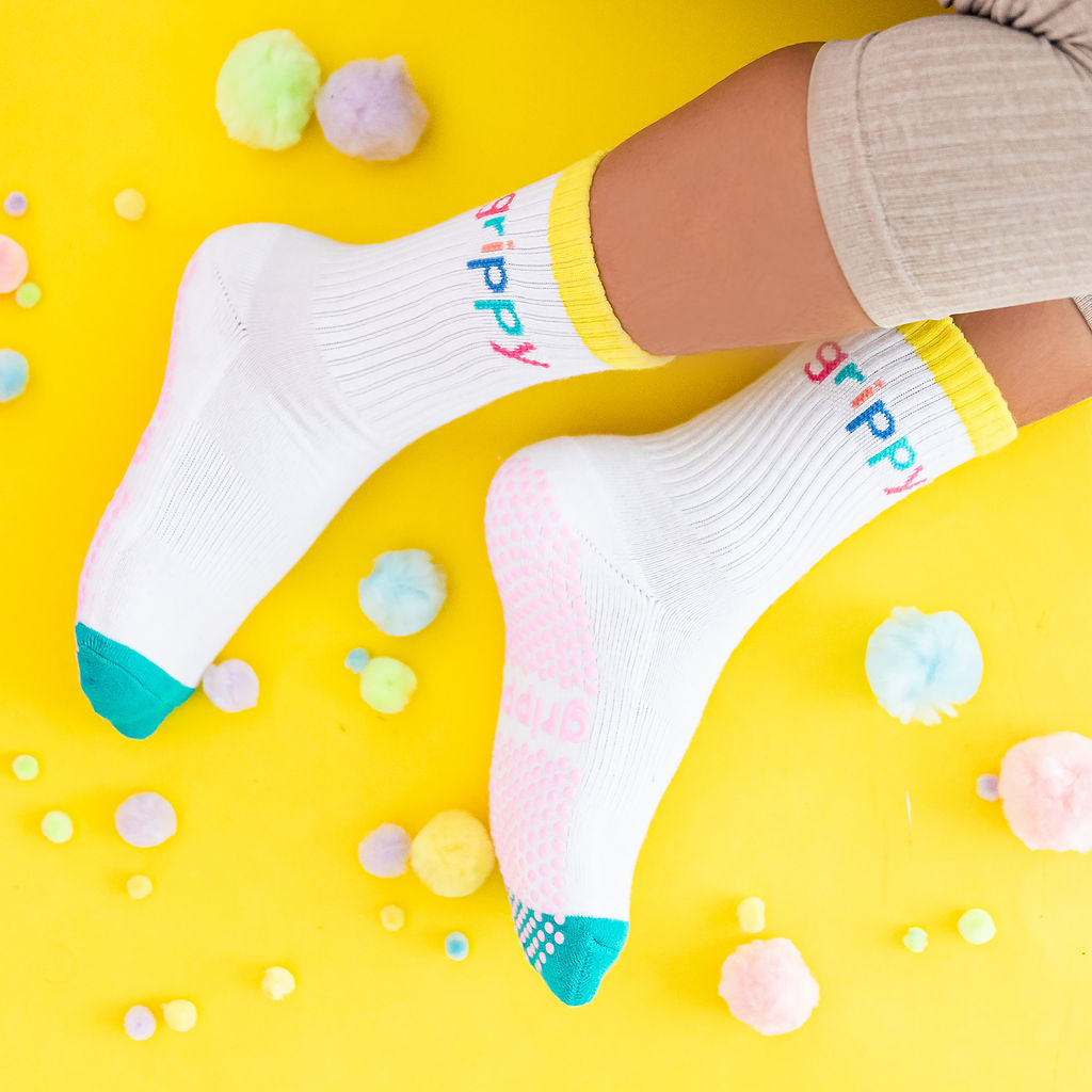 - White with coloured 'GRIPPY' text on each ankle