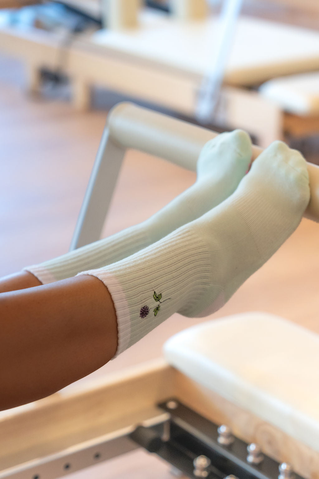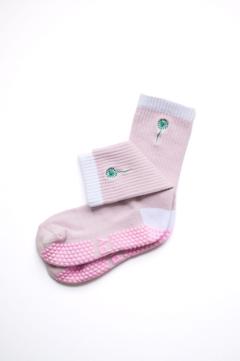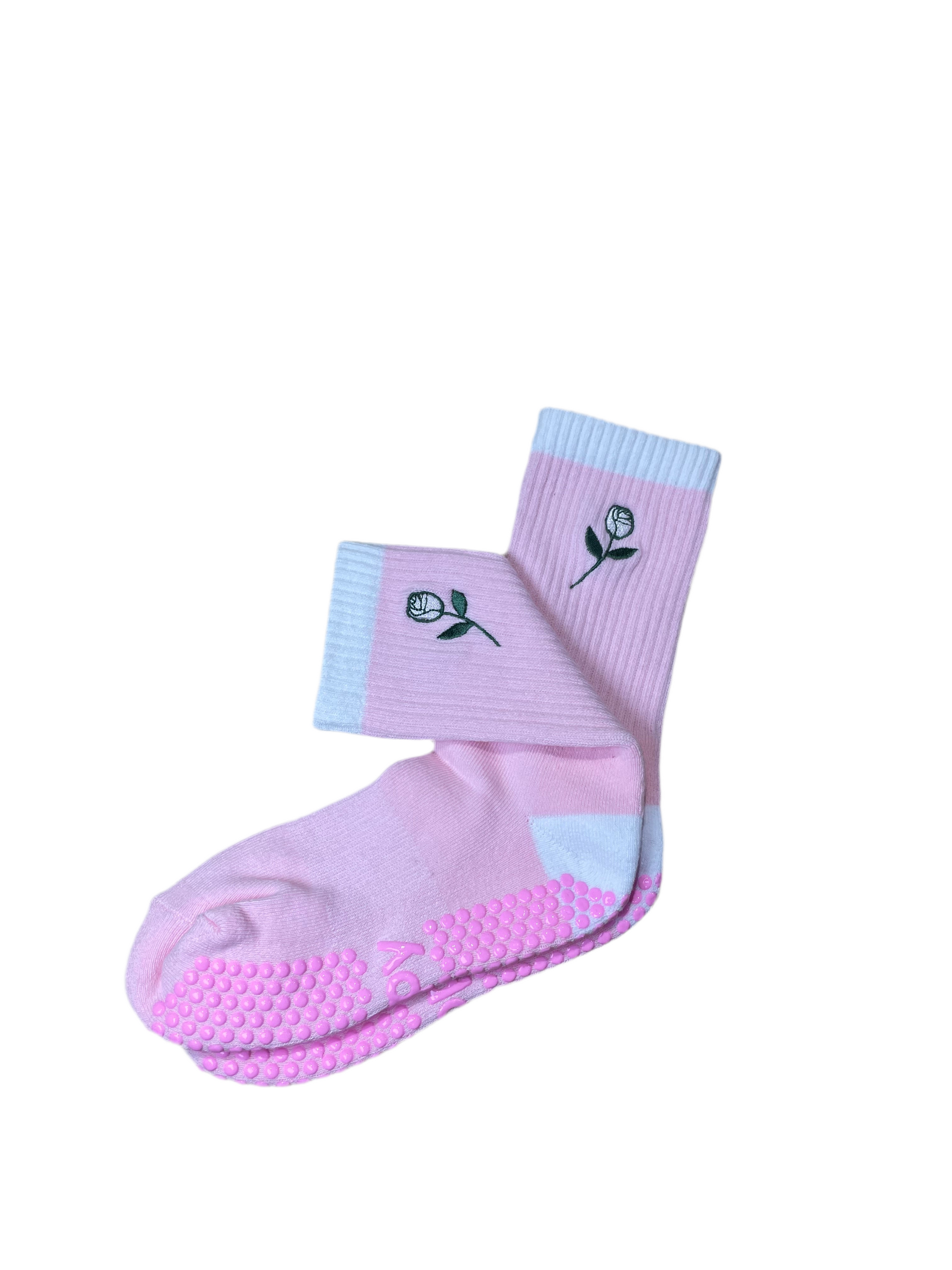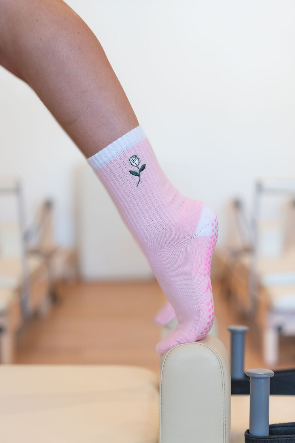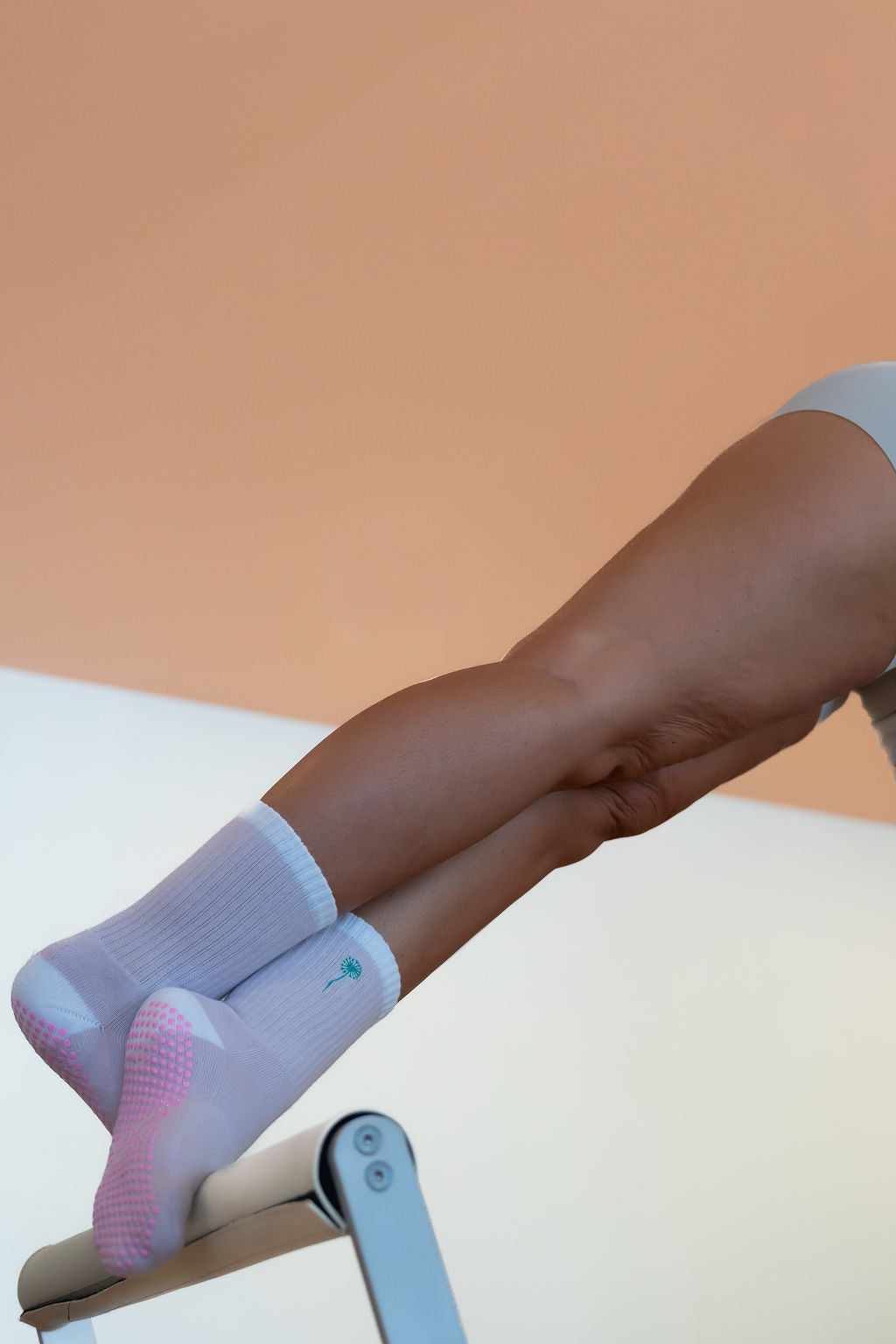Our socks are made from a cotton blend with spandex for a super comfy, stretchy fit, with terry lining for extra durability and a compression arch to hug your foot. Our signature non-slip pink grippy dots will work as hard as you do each workout.